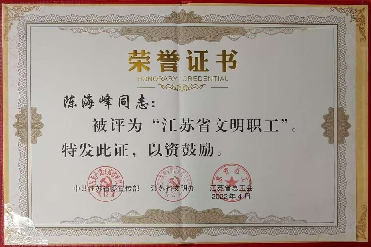 2022年4月24日,中共江苏省委宣传部、江苏省文明办、江苏省总工会联合发文命名表彰一批“江苏省十佳文明职工”和“江苏省文明职工”。经基层推荐、媒体公示、群众点赞评议和专家评审等程序,全省共评出10名“江苏省十佳文明职工”、150名“江苏省文明职工”。我校陈海峰老师荣获“江苏省文明职工”荣誉称号。